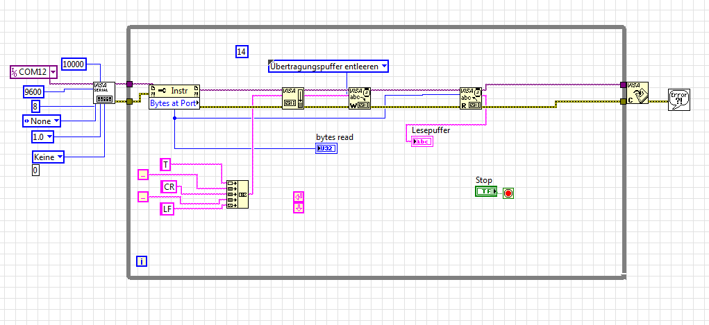Ich hatte das Problem, dass ich einen Timeout error erhalte, meines Erachtens weil Labview auf Ergebnisse wartet (in diesem Fall 14Bit) aber diese nicht erhält, da die Waage ihrerseits keinen Befehl dazu hat.