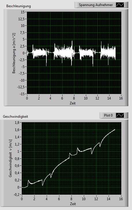Ohne sorgfältige Offsetkorrektur des Beschleunigunsaufnehmers funktioniert die Wegberechnung überhaupt nicht. Der Offset (-dabei kann es sich auch um die Erdbescheunigung handeln-) bewirkt im Wegdiagramm schon mal eine gleichmäßig beschleunigte Bewegung, ohne dass sich der Sensor von der Stelle rührt.