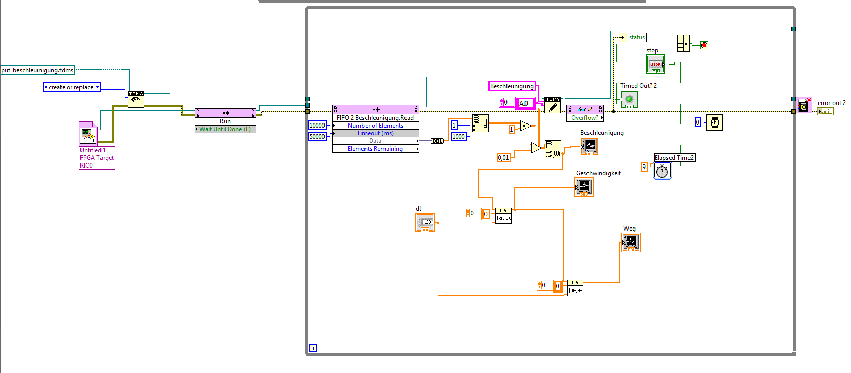 ich kenne mich noch nicht so gut mit Labview aus. Ich versuche es aber trotzdem, ein Beschleunigungssignal 2mal zu integrieren, sodass ich den Weg erhalte. Was ich an meiner Messung nicht verstehe ist, warum sowohl die Geschwindigkeit, als auch der Weg immer wieder auf Null zurückspringen. Wäre schön wenn mir jemand weiterhelfen könnte.
