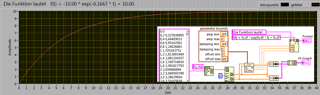 Ich habe das ganze mal über die Messzeit geplottet (s. Anhang). Rot sind die Messdaten (bzw hier eine idealisierte E-Funktion) Blau ist mein Regression wie oben beschrieben. Grün ist die Amplitude nach dem Exponential Fit.
