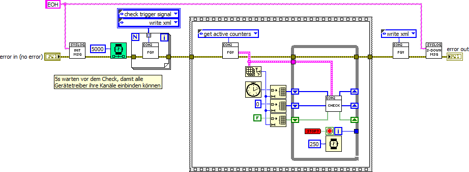 Außerdem würde ich weder beim Einlesen noch beim Wegschreiben der Zeiten die Nachkommastellen wegrunden. Dann würde ich wahrscheinlich auch eher eine Dateireferenz öffnen und die offene Referenz zum Schreiben benutzen. Und das Zeitmanagement für das Schreiben der Datei ist hier sicher gut mit dem "einzig legitimen" Express-VI "Verstrichene Zeit" zu erledigen. Dann kann einem nämlich der Schleifentimeout egal sein.