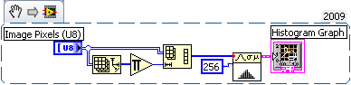 Das graue Bild, dass dann aus dem RGBtoGray-sub-vi herauskommt, soll dann in mein Histogram-sub-vi und als Histogramm ausgegeben werden, das mir eben sagt wie oft welcher der 256 Grauwerte vorkommt. An dieser Stelle ist mein Problem, dass ich nicht weiss, ob wie groß ich den Array aufziehen soll. Muss der so große sein, wie die Pixelzahl der Bilder, die meine Kamera macht? (Beispielsweise 640x480, wenn die Bilder der Kamera 640x480 Pixel groß sind?)