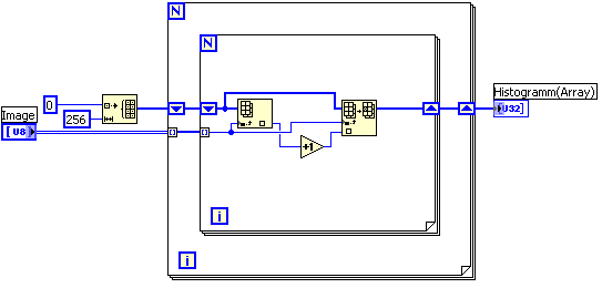 Das graue Bild, dass dann aus dem RGBtoGray-sub-vi herauskommt, soll dann in mein Histogram-sub-vi und als Histogramm ausgegeben werden, das mir eben sagt wie oft welcher der 256 Grauwerte vorkommt. An dieser Stelle ist mein Problem, dass ich nicht weiss, ob wie groß ich den Array aufziehen soll. Muss der so große sein, wie die Pixelzahl der Bilder, die meine Kamera macht? (Beispielsweise 640x480, wenn die Bilder der Kamera 640x480 Pixel groß sind?)