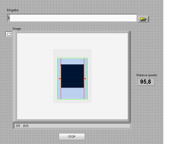 Versuche nun die horizontale Komponente über das VI "ImaQ Clamp horizontal max" und die vertikale Komponente über "ImaQ Clamp Vertical max" auszuwerten.