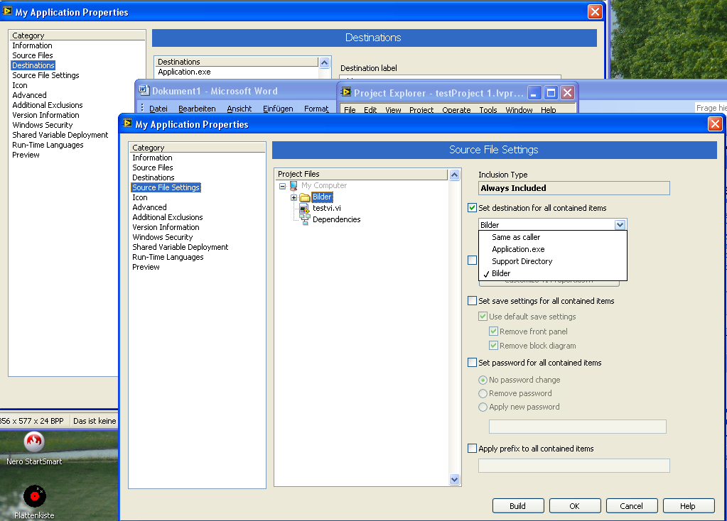 Schritt 4: Jetzt Source File Settings – Project Files – Ordner Bilder selektieren und unter „Set destination for all contained items den unter Schritt3 erzeugten Ordner „Bilder“ auswählen.