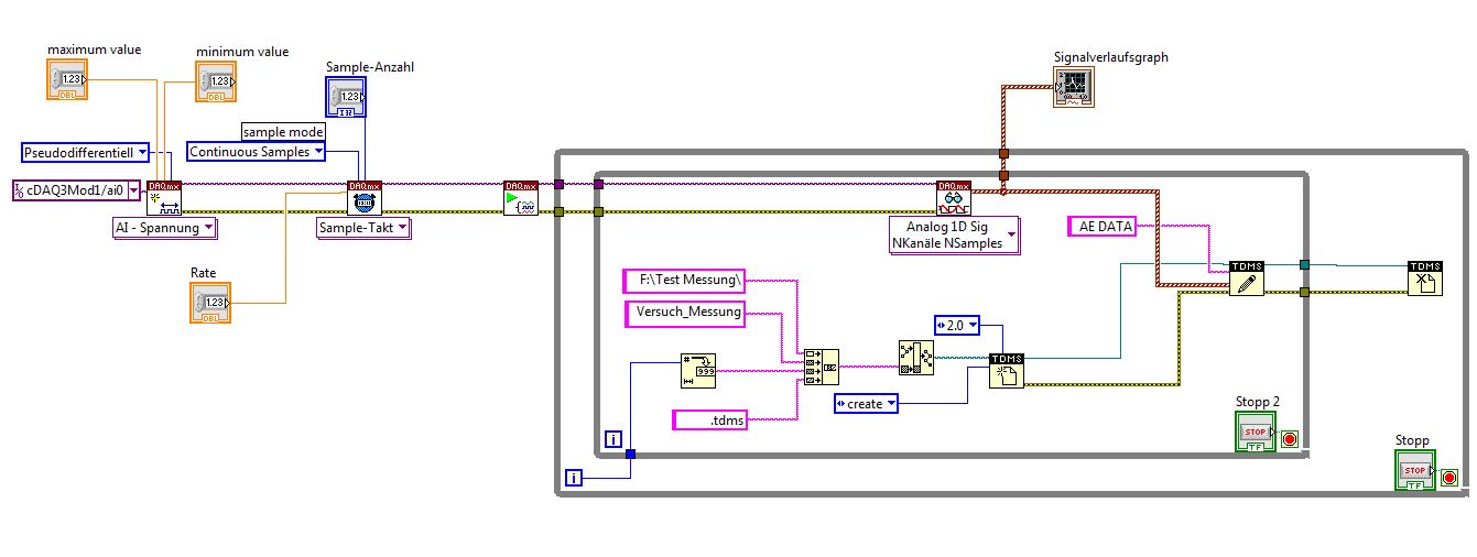 Nun zu meinem Problem, ich bin angehender Bergbauingenieur und habe folglich vor dieser Arbeit noch nie etwas von Labview gehört. Dementsprechend ist auch mein Wissensstand was diese Programm betrifft. Um für die Programmierung ein Messsignal zu erzeugen dient mir ein Oszillator, der an eine Messkarte angeschlossen ist und die Messdaten wiederum über USB an den Computer überträgt. Ziel dieser Programmierung soll es nun sein, dass die Messung einmal pro Stunde für eine Minute stattfindet, das Signal verwertet und während der Messung in einem Graphen sichtbar macht, sowie für jede Messung eine neue .tdms Datei anlegt, beschreibt und dann zur späteren Analyse abspeichert.