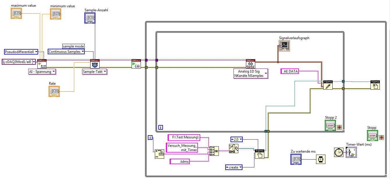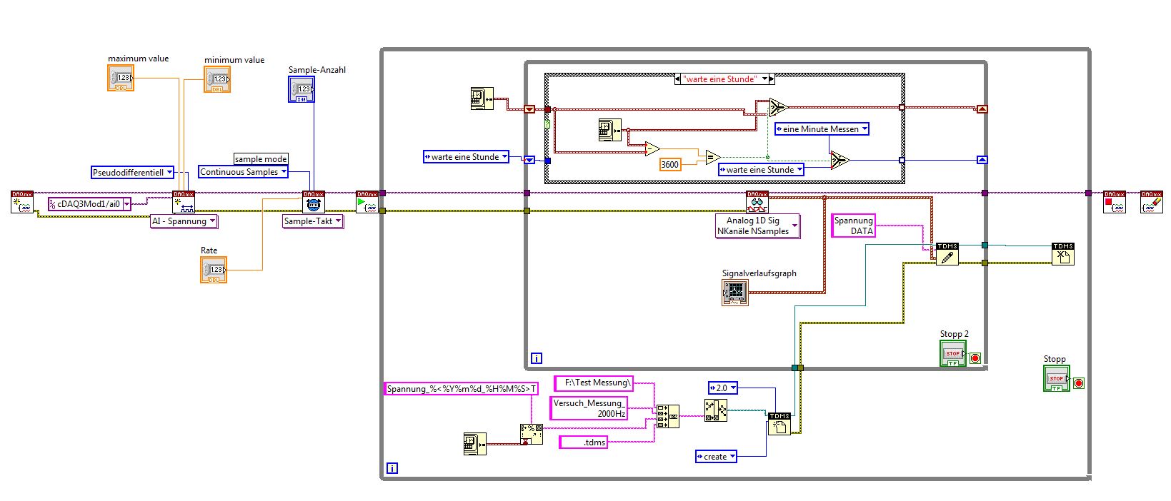 Zitat:Ziel dieser Programmierung soll es nun sein, dass die Messung einmal pro Stunde für eine Minute stattfindet, das Signal verwertet und während der Messung in einem Graphen sichtbar macht, sowie für jede Messung eine neue .tdms Datei anlegt, beschreibt und dann zur späteren Analyse abspeichert.