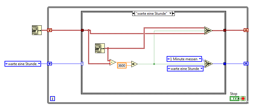 States könnte folgende sein: INIT DAQmx, WarteStunde, ÖffneTDMS, MessDaten abfragen und speichern, SchließeTDMS, CLEANUP…