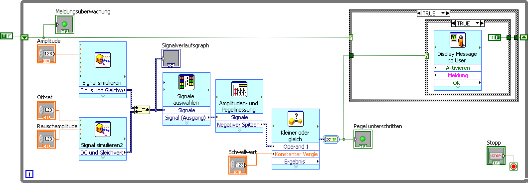 Mit einer kleinen Zusatzfunktion möchte ich die Spannung einer angeschlossenen Batterie überwachen. Sobald die Spannung unter 8,5V sinkt, soll ein Dialog Fenster mit der Nachricht "Low Battery" erscheinen. Ich habe mir das VI schon zurechtgebastelt. Allerdings stoße ich an folgender Stelle nun auf ein Problem:
