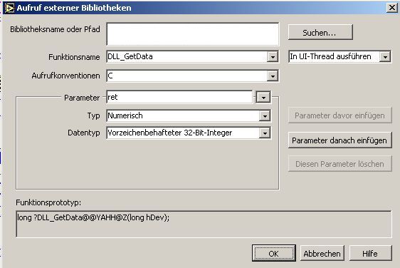 Mein Projektpartner hat das gepostet, und es funktioniert "theoretisch" auch, also der Rückegabewert bestätigt einen gültigen Aufruf, jedoch gibt es gewisse Personen welche nicht glauben das ein C-Programm mit 3 Eingangsvariablen mit insgesamt 12 Eingangswerten von LV aus aufgerufen werden kann.