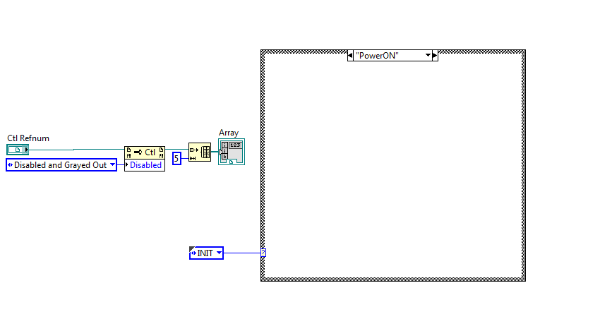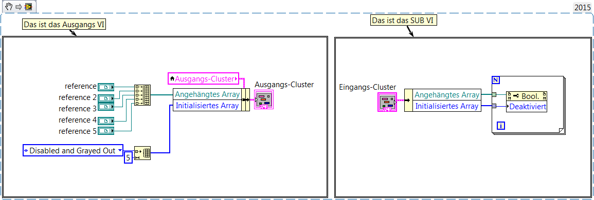 Besser wäre es aber, wenn du das subVI erweitern würdest: für deine Anwendung wäre es vielleicht sinnvoll, die Eingänge als Arrays auszuführen: ein subVI-Aufruf für mehrere Controls. Und die Referenzen nicht als strikt-typisiert, sondern als möglichst generisch vorsehen, damit du alle Control-Typen dis-/enablen kannst…