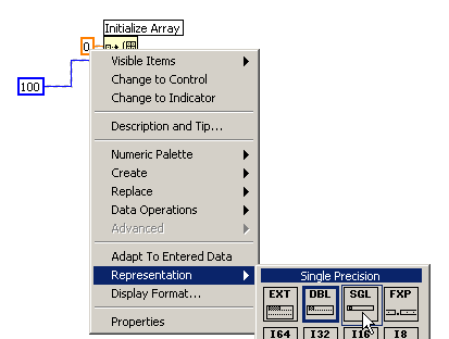 Ich nehme mal an, dass du probierst, für das "Rückgabe-Array" in LabVIEW per "Initialize Array" Speicher zu reservieren und beim Eingang "element" einfach auf "Create->Constant" geklickt hast. Damit wird dir eine Konstante vom Datentyp "double" erzeugt. Umstellen auf Datentyp "single geht über "Rechter Mausklick->" und dann siehe Screenshot:
