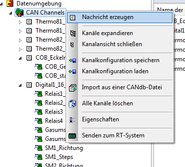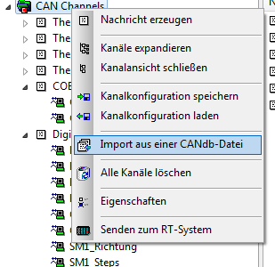 Import einer dbc-Datei. Nach dem Kontextmenü öffnet sich ein Dialog, in dem die zu importierenden Nachrichten ausgewählt werden müssen.