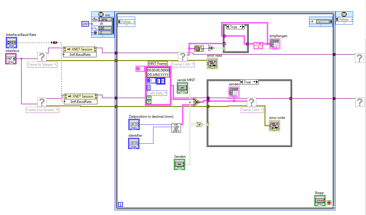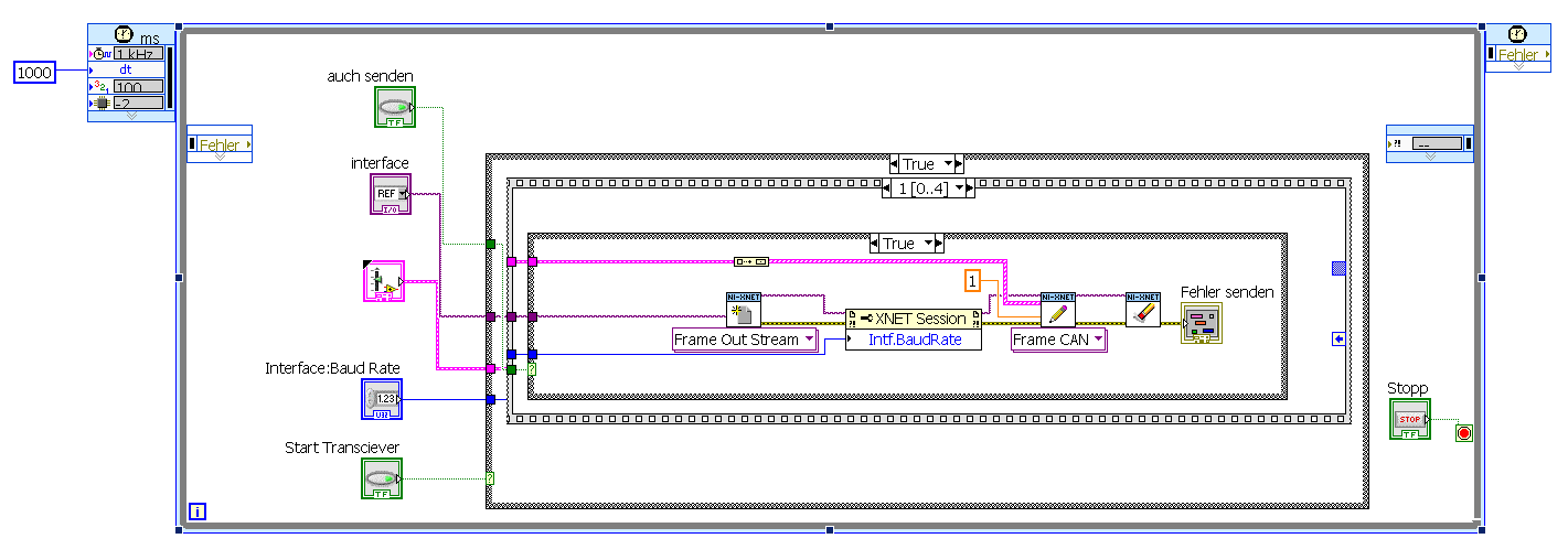 es wird (gemächlich) in einer Timed While Loop auf dem cRio RT ausgeführt . Wenn ich die Taste "Start Transciever" drücke wird eine Sequenz durchlaufen in der ich zuerst ein Frame auf den Bus schicke und anschließend ein Frame vom Bus lesen möchte. Das senden ist optional, d.h. es wird nur ein Frame gesendet wenn ich die Taste "auch senden" drücke. Das habe ich zum Beispiel benutzt um die Bootup Nachricht des Netzgeräts auszulesen.