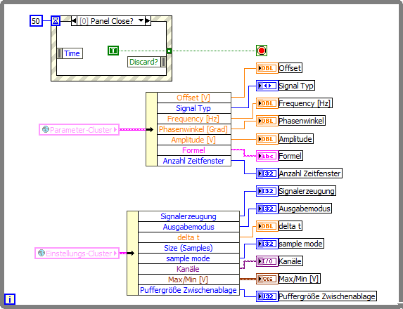 Im Grunde habe ich das Problem ja lokalisiert, in der Menü-Loop läuft eine Statemachine die im Zustand "Leerlauf" auf ein Ereignis wartet. Also in meinem Problemfall "aktuelle Einstellungen", darauf wechselt der Zustand in "aktuelle Einstellungen" und öffnet das Sub-Vi, indem die Schleife läuft und die Einstellungen anzeigt. Das Sub-VI hänge ich gerne an.