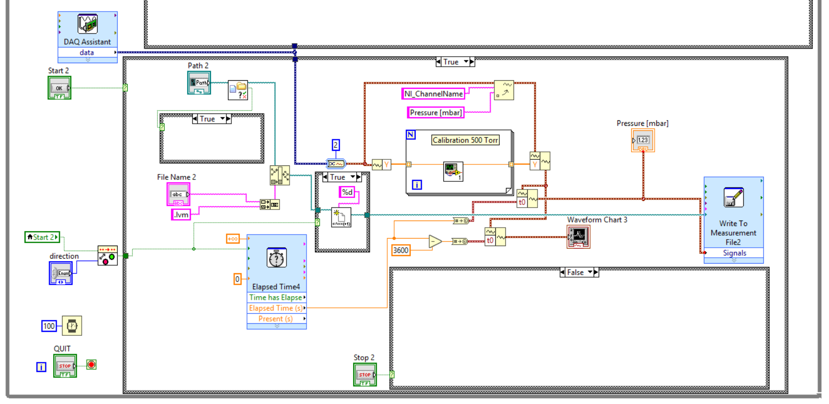 für ein Projekt soll ich zwei unabhängige LabVIEW-Programme in ein Programm schreiben, da die Programme beide auf einen A/D-Wandler zugreifen und daher nur ein DAQ Assistant benutzt werden kann (für DAXmx ist das Problem dasselbe wenn ich das richtig getestet habe). Bei diesen Programmen werden Drücke in Form von Spannung ausgelesen und abgespeichert - dabei werden auch elektro-pneumatische Ventile geschaltet (Das ist wahrscheinlich für die Problemstellung nicht so wichtig, aber ich wollte das trotzdem kurz erwähnen). Vorher wurde die Zeitnahme so realisiert, dass durch Drücken des Start-Buttons einer Messung in eine For-Schleife gewechselt wurde und die Startzeit des Charts über "Get Date/ Time in seconds" als Datenfluss von außerhalb der Schleife in die Schleife auf 0 gesetzt wurde. Ich hoffe das ist einigermaßen richtig ausgedrückt... Jetzt habe ich mir gedacht ich könnte die einzelnen Experimente ablaufen lassen, indem ich Case-Strukturen einbaue, die über zwei Start-Buttons aktiviert werden.