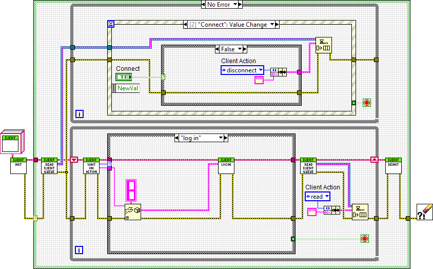 Bitte startet das Client.vi und trägt die o.g. Ip-Adresse ein, danach Connect und Login (Passwort ist z.Z. egal).