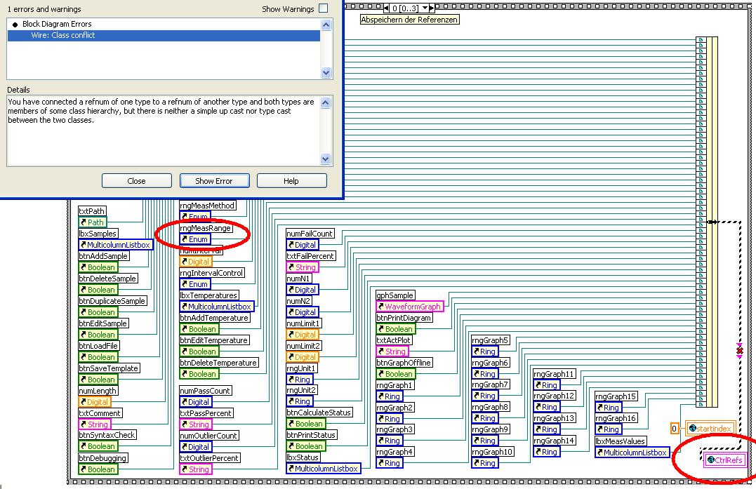 Ich habe im Frontpanel zum Enum rngMeasRange einen Eintrag hinzugefügt. Leider funktioniert jetzt die Verbindung zu der Globalen Variable nicht mehr (beides Rot eingekreist). Allerdings verstehe ich nicht so ganz warum... es müsste ja eigentlich nur um die Referenz zum Enum gehen und die ändert sich ja nicht oder?