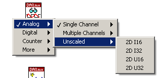 Nimm irgendein Bsp zur Spannungsmessung aus dem NI-Examplefinder, und bei DAQmx-Read musst du (IMHO) dann "Analog->Unscaled->..." auswählen.