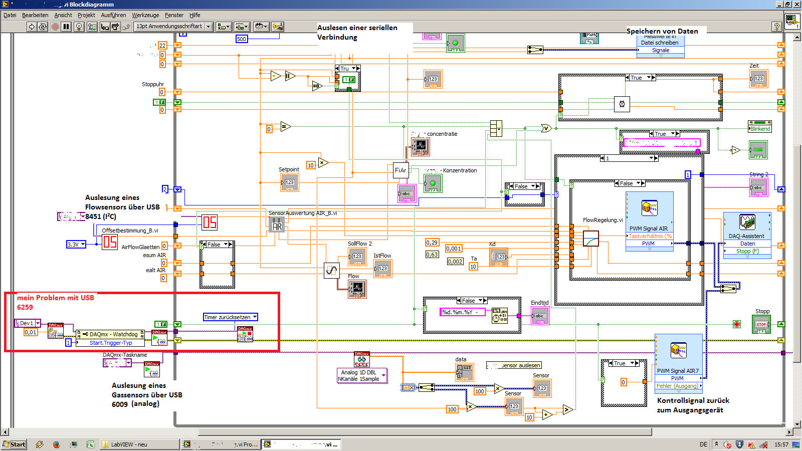 Ich regel mit dem USB 6259 (DAQ - Assistenten) Ventile über ein PWM - Signal. Dazu kommt ein Kontrollsignal, das zurückgeführt wird zum Ausgangsgerät. Beide Signale müssen im Fehlerfall des Programms oder des Laptops auf Null gesetzt werden. Dies hat letztes Jahr funktioniert! Ich hab allein die Auslesung des Gassensors hinzugefügt. Deshalb verstehe ich es nicht und verzweifel so langsam..