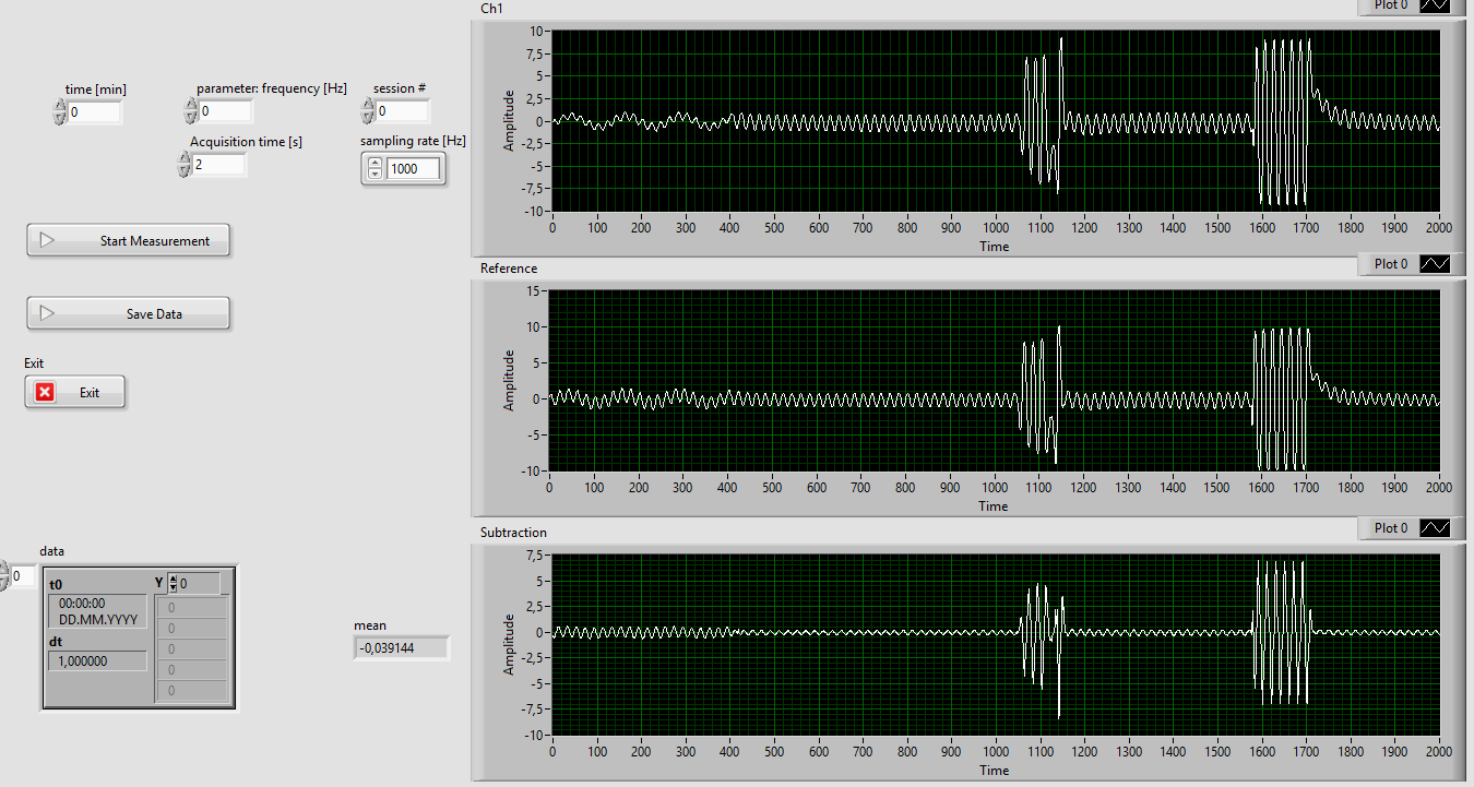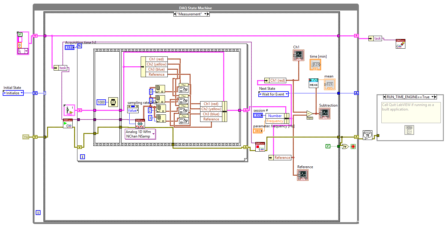 Die Idee ist also ganz einfach: Ich habe die Standard State Machine von LV so umgebaut, dass bei "Klick" 4 DAQ Channel (ist ein USB-6003) mit einer vorgegebenen Samplerate gleichzeitig ausgelesen werden, für genau X Sekunden. Das Projekt ist im Anhang.