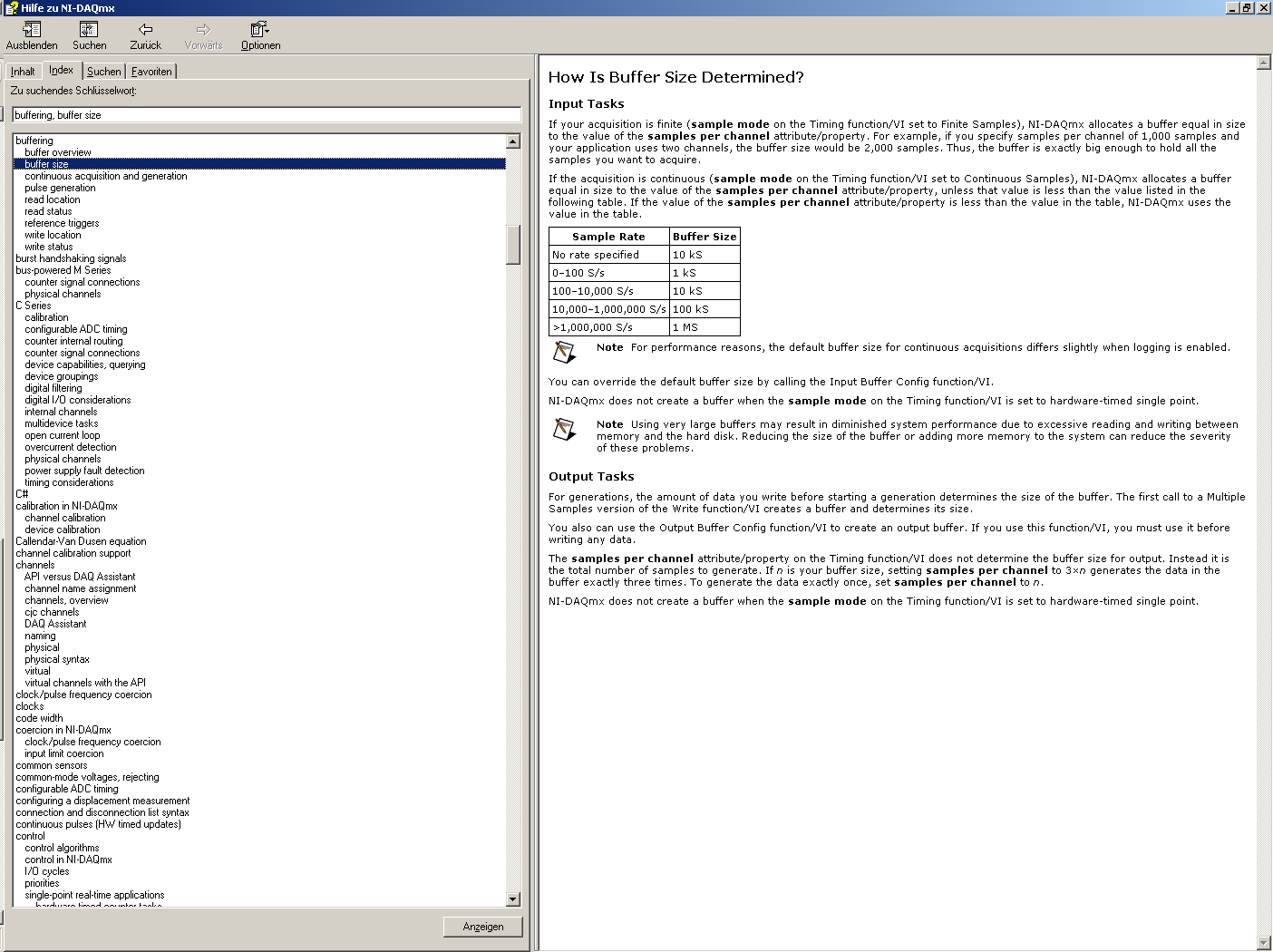 (05.02.2012 20:24 )taktbar schrieb:  Beachte dazu das Kleingedruckte in der Hilfe zum VI "Sample-Takt": Im Modus "Kontinuierlich" ist der Eingang "Samples pro Kanal" (der hier keinen Sinn macht) umfunktioniert zu "Puffergröße"!