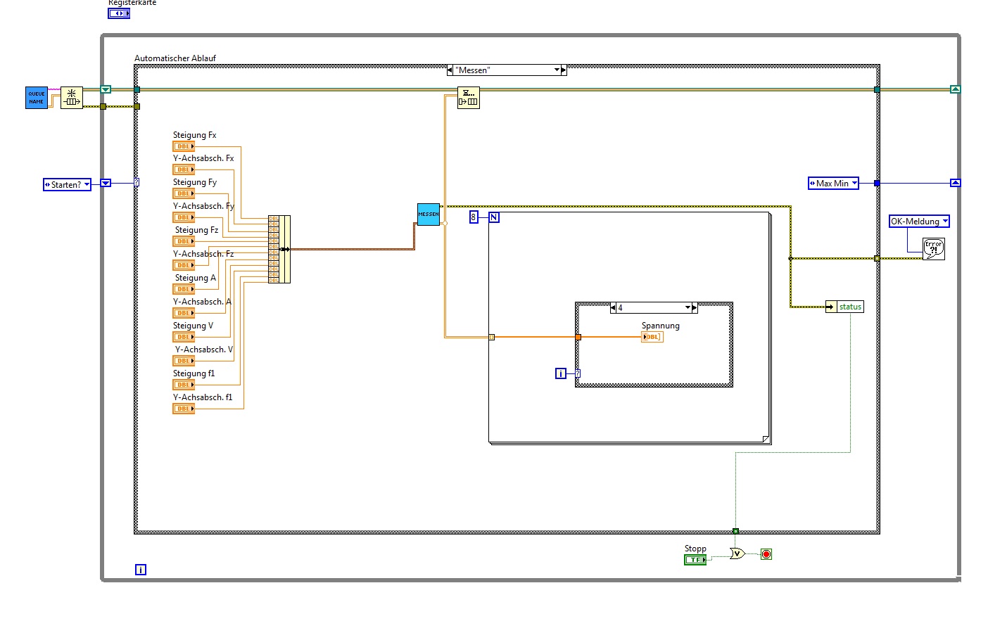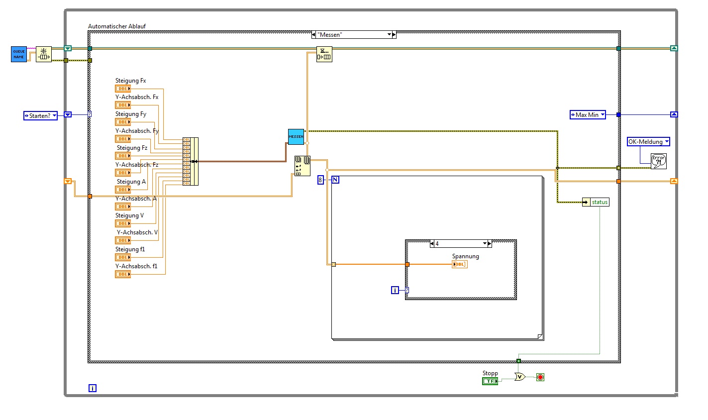 Wo wir schon beim Aufräumen sind: es ist äußerst "unüblich", den ErrorOut oben rechts anzuschließen (wie beim VI "Messen"). Es gitb einen Styleguide, der sowas beschreibt. Hast du schon mal eine Funktion von NI gesehen, die die Error-Anschlüsse oben hat?