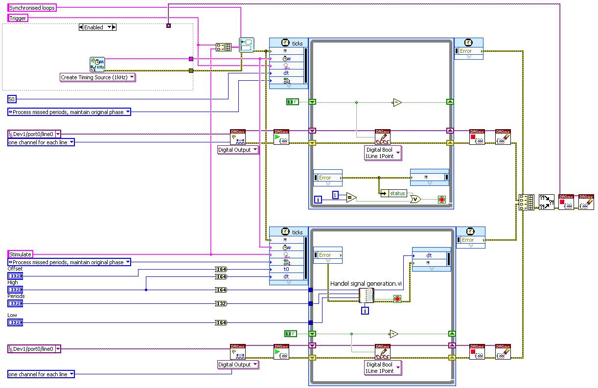 ' schrieb:Ich würde einfach (und weil du alle Tasks auf einer Karte laufen läßt ist es tatsächlich sehr einfach) die ganze AI/AO Geschichte auf Hardware-Timing umstellen und und auf die Timed Loops komplett verzichten. Beispiele dazu wie das geht gibt's im Example Finder ...