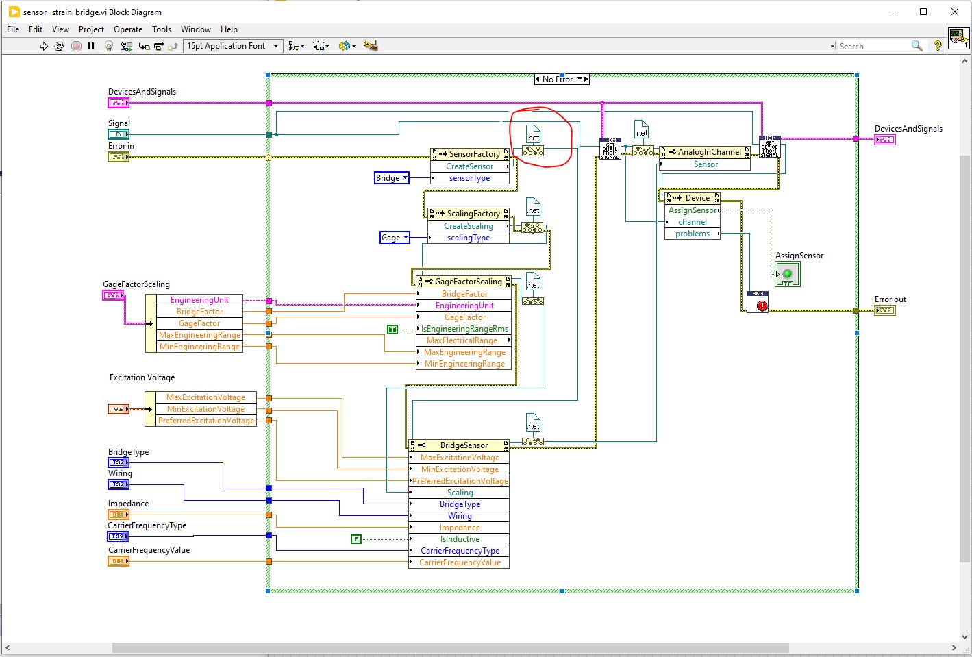 Da ich ja eine DMS Halbbrücke konfigurieren möchte, habe ich die sensor_strain-bridge.vi integriert, aber eben jene generiert einen Fehler bei einer Framwork Referenz (siehe Bild).