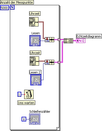 Nachwievor bleiben die Aufzeichnungspunkte aber im LabView bei 10ms. Und was mich hier auch wundert: im Diagramm gibt es Punkte, an denen 2 Werte zum gleichen Zeitpunkt abgebildet sind. (d.h. ein senkrechter Schritt). Wie ist das möglich? Ist es so, dass LabView pro Schleifendurchlauf mehrere Werte aufnimmt, aber nur einen Zeitpunkt?
