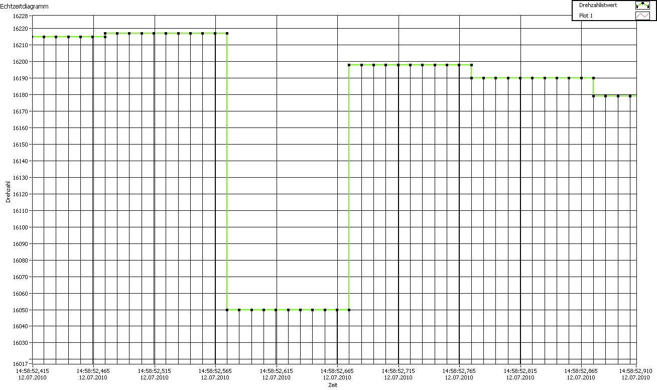 Nachwievor bleiben die Aufzeichnungspunkte aber im LabView bei 10ms. Und was mich hier auch wundert: im Diagramm gibt es Punkte, an denen 2 Werte zum gleichen Zeitpunkt abgebildet sind. (d.h. ein senkrechter Schritt). Wie ist das möglich?
