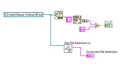 Vermutlich seit LabVIEW8.2 gibt es da ein Funktion unter "File I/O- Advanced- Get File Extension.vi" (das untere im Bild)