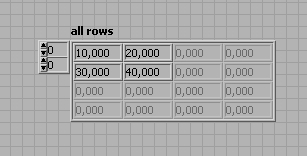 meinst du das Terminal für das 2D-Array? Das hab ich einfach mit "Create Indicator" am "all rows"-Anschluss erzeugt, das dazugehörende FrontPanel-Element ist der graue Screenshot...