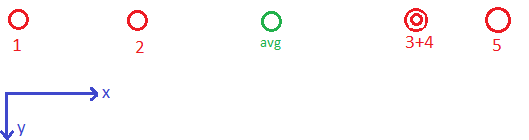 Nun ist es mein Ziel aus den 5 Punkten, jene 2 auszuwählen, welche links und rechts vom avg am nächsten sind (Der avg-Punkt wurde vorher bereits berechnet - zur Anmerkung: dieser ist das Ergebnis zweier anderer Punkte, nicht der avg der 5 Punkte).