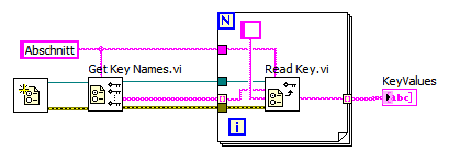 ' schrieb:man kann doch mehrere Male hintereinander mit jeweiliger Angabe des entsprechenden Keyname lesen. Eleganter ist zwar die Verwendung einer For-Schleife, das setzt jedoch voraus, daß der Datentyp von allen Keys der gleiche ist. Das ist machbar, indem man alle Keyvalues in das Format Text konvertiert (Für diese Hin/Rückkonvertierung gibts VIs).