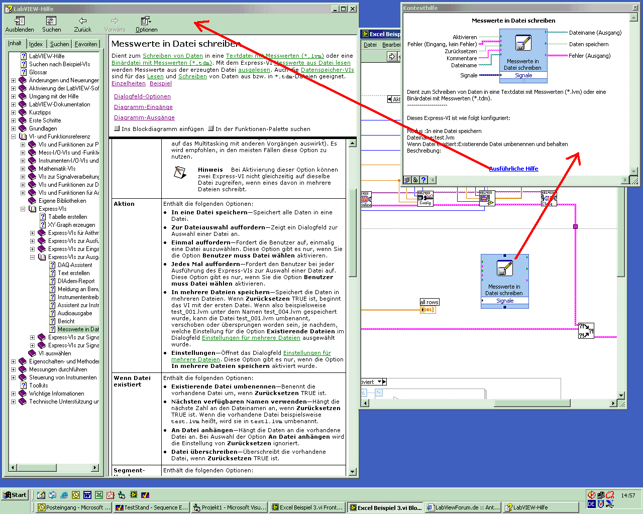 Befindet sich die Maus nämlich über einem Express-VI, so steht im Fenster der Kontexthilfe ganz unten ein blauer Link zu weiterführenden Erläuterungen in der Hilfe-Datei. Auch steht bei den Express-VIs i.d.R. im Fenster der Kontexthilfe, wie es konfiguriert ist, d.h. welche Werte an den Eingängen des VIs anliegen.