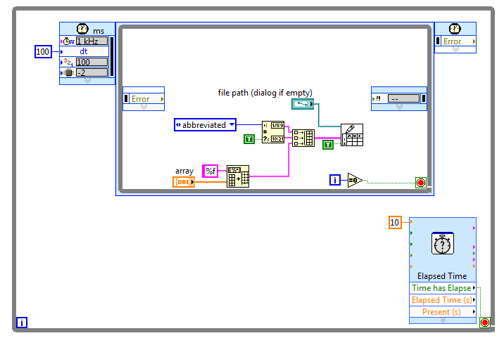 Ich habe ein Programm erstellt, mit dem Messwerte erfasst, angezeigt und schließlich in ein Excel-file geschrieben und dort gespeichert werden. So weit so wunderbar, klappt an sich alles ganz flüssig. Jetzt soll noch folgendes Feature eingebaut werden: Auf Knopfdruck sollen die Messdaten für 10 Sekunden mit einer vorgegeben Frequenz (z.b. 10 Hz) in ein File geschrieben werden. Währenddessen soll natürlich die Anzeige der Messdaten weiterlaufen. Realisiert habe ich das Ganze mit einem Timed Loop und einem zweiten Loop, welcher abgebrochen wird, sobald eine bestimmte Zeit abgelaufen ist ( siehe Anhang).