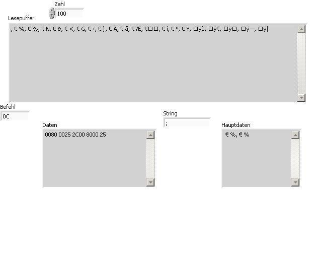 Die Kommunikation zwischen den beiden klappt soweit erstmal, da ich die Seriennummer des Gerätes nach einem bestimmten Befehl in einer Anzeige erhalte und ich auch das Gerät auf Null `reseten` kann. Nur leider überträgt mir der Messverstärker die benötigten Messdaten nicht. Ich erhalte nur kryptische Zeichen mit vereinzelten Zahlen, die aber auch mit den Messungen nicht übereinstimmen!