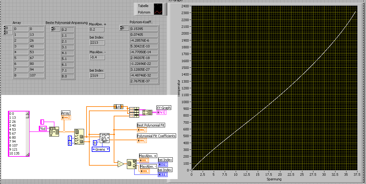 Habe nur LV7.1, aus unerfindlichen Gründen läßt sich die Funktion "polynomial fit" nicht in 7.0 konvertieren. Hier die Bilder und ein VI in 7.1