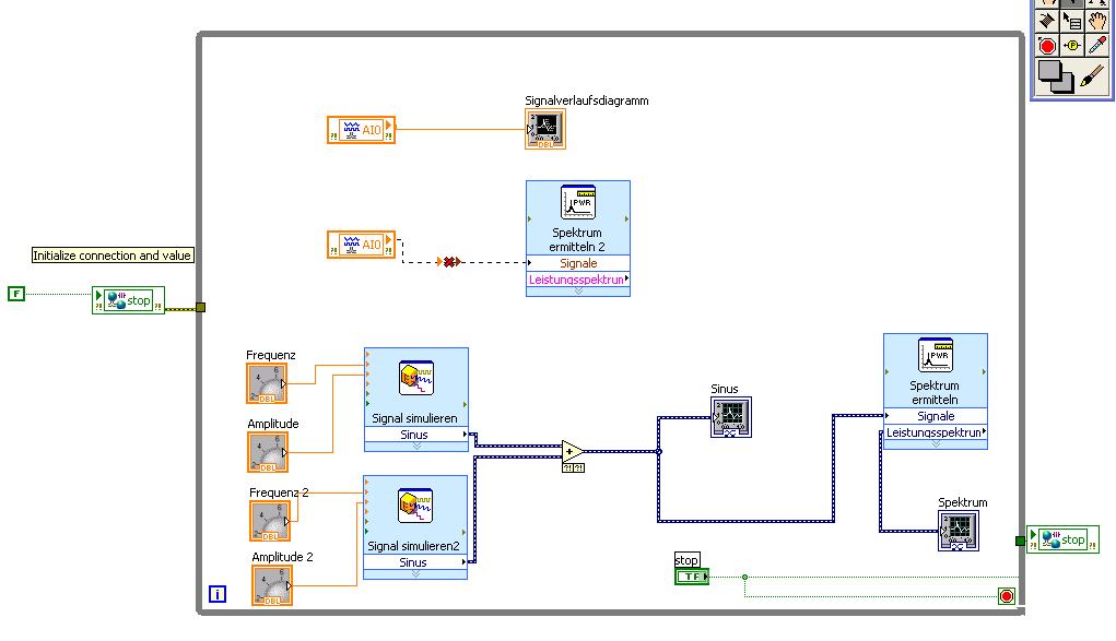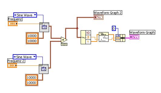Im unteren Teil des VI erstelle ich ein künstliches, aus 2 Sinus zusammengesetztes Signal und ermittle damit problemlos mein Spektrum.