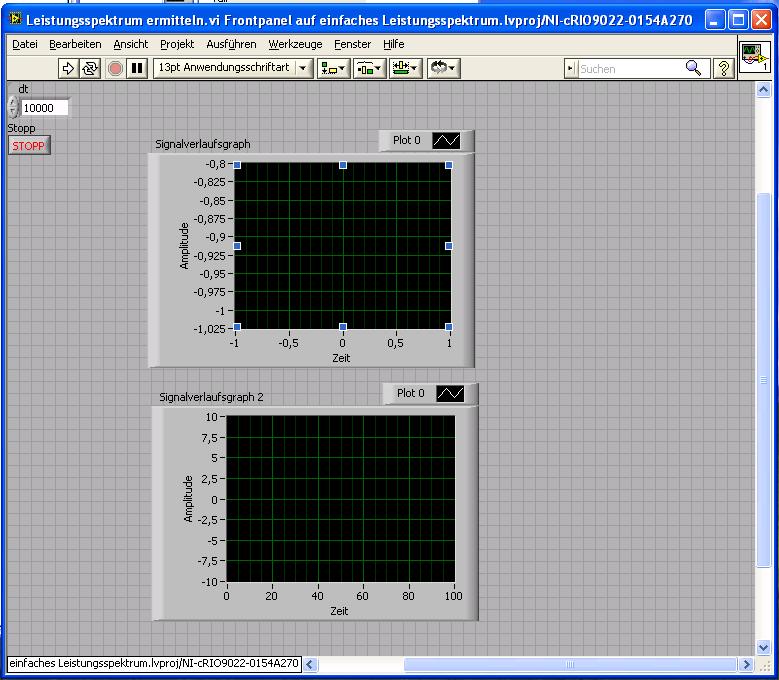 Im oberen Teil ist an AI0 ein Signalgenerator angeschlossen, der über den Compactrio eingelesen wird. Angezeigt wird das Signal, aber ich kann kein Leistungsspektrum daraus erzeugem. Zusätzlich ist das Signal nicht schön dargestellt (zweiter Screenshot, eingestellte Frequenz: 1Hz). Die Fehlermeldung: Unterschiedlicher Dateityp. Datenquelle ist 64bit reell und Datensenke ist Signalverlauf. Kann man das konvertieren? Und in einem zweiten Schritt: kann man das Signal nicht so abgestuft darstellen?
