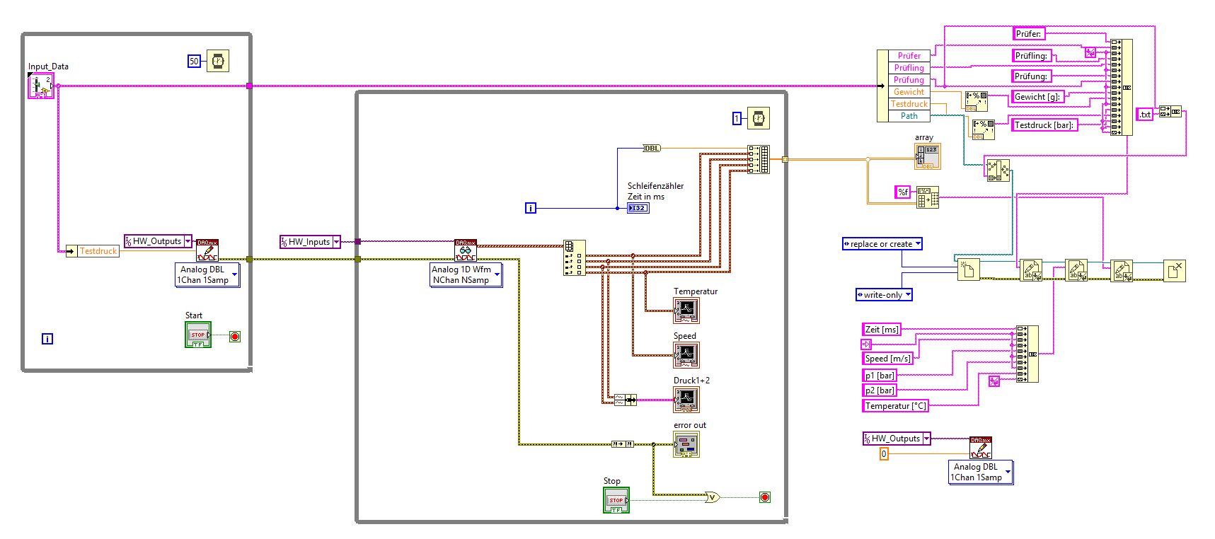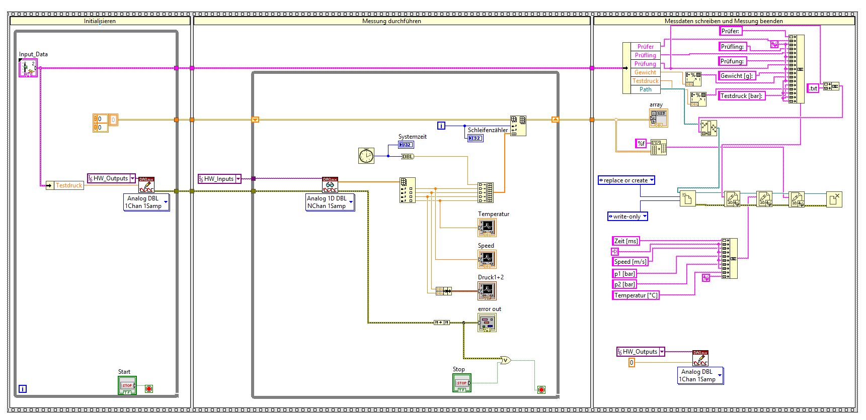 Über den Analogoutput gebe ich einen Druck vor. Daraufhin werden 3 Signale (2x Druck, 1x Geschwindigkeit) über die analogen Spannungseingänge + die Temperatur gemessen. Die Messdaten inklusive Tick Count schreibe ich mittels einer While-Schleife und einem Schieberegister in ein Array, welches ich mir nach Beendigung der Messung in eine Textdatei schreibe. Soweit funktioniert alles prima - so wie es soll.