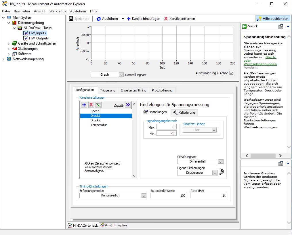 Meine Timingeinstellung für die AI sind eine kontinuierliche Datenerfassung mit 100 zu lesenden Werten und einer Abtastrate von 1000Hz, welche ich über einen Task im NI Max festgelegt habe.