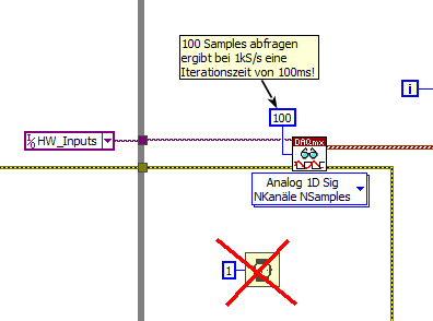 Wenn dein VI deine Timingeinstellungen respektieren soll, dann solltest du bei DAQmxRead auf "N channels N samples" umstellen und gleich 100 Samples abfragen - dann kommst du auf eine (üblicherweise empfohlene) Iterationszeit von 100ms!