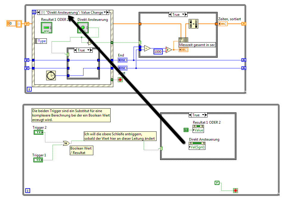 Ich habe das Problem mal im beiliegenden VI ausformuliert. Ich will aus einem Trigger in der unteren Schleife einen Rundenzeitenzähler in der oberen Schleife ansteuern. Wenn ich oben ein Bedienelement als Trigger nehme funktioniert alles bestens - wie am im VI sieht. Ich muss aber als Trigger ein Resultat aus einer anderen, komplexen Berechnung (in der unteren Schleife) verwenden und da beginnt das Problem.