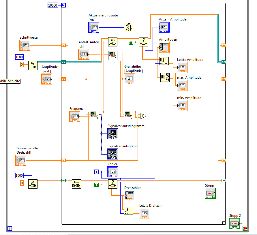 Im Bild ist mein bisheriges Programm. In die SubVIs habe ich nur einige Funktionen ausgelagert, wie die Simulation der Resonanzschwingung, die Feststellung des Vorzeichens für den Drehzahlschritt, etc, die spielen also für das Problem keine Rolle. Wie man sieht, füge ich die gemessenen Amplituden und die Drehzahl jeweils in eine Queue ein. Gibt es eine Möglichkeit, wie ich diese Messwerte mehrfach abtasten kann? Ergebnis wären dann eine Queue mit 1000 Werten in der Original-Abtastrate, eine Queue mit 100-500 Werten in der Original-Abtastrate und eine Queue, in die alle paar Minuten die aktuellen Werte gespeichert werden.