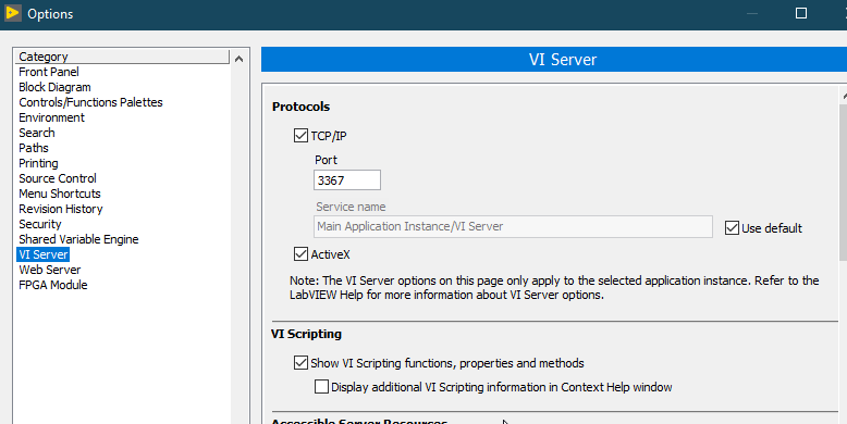 LabVIEW -> Pulldown-Menü Tools -> Options -> VI Server: