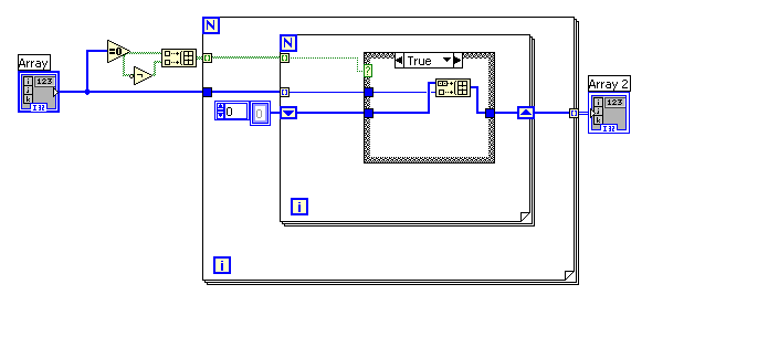 Ansonsten werden alle Array-Elemente in der Schleife abgegearbeitet. Wenn das Element null ist, wird der Index dieses Elementes als Arrayelement dem Schieberegister 1 hinzugefügt. Ist es ein Element ungleich Null, dann wird ein Cluster gebildet, betehend aus Index und Wert, und dieser Cluster wird als Array-Element dem Schieberegister 2 hinzugefügt.