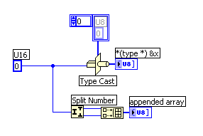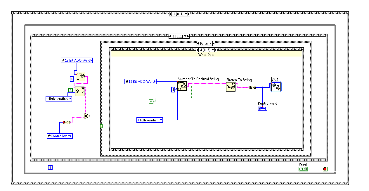 Ich bin momentan an meiner Abschlussarbeit: Einen Analogwert wird von einem 12Bit ADC eingelesen, und via SPI dem Datenerfassungstool myRIO weitergegeben. Der Wert wird nun im Labview verarbeitet, und dann wieder via SPI über das myRIO auf einem LCD angezeigt. Ich bin nun praktisch am Schluss mit der Realisation. Ich kann die Werte des ADC korrekt via SPI einlesen und im LabVIEW verarbeiten. Ebenso kann ich Zeichen welche ich in einen String schreibe, auf dem LCD ausgeben. Ich habe nun bei dem zusammenfügen dieser zwei Komponenten etwas Mühe: Das SPI-Interface verarbeitet 8Bit - Arrays. Der auszugebende Wert hat jedoch den Datentyp unsigned Word.