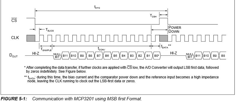 hat eine Auflösung von 12 Bit. Das Signal wird als SPI - Protokoll ausgegeben. Gemäss Datenblatt brauch der MCP3201 die ersten zwei Clocks (somit auch Bits) für die Sampletime. In einem weiteren wird das 0Bit übertragen. Das heisst, ich muss den Wert erst mal maskieren, um an die "brauchbaren" Daten heranzukommen. Dies geschieht mit einer AND-Verknüpfung. (Z.B. in C: Port1 &= 0xF0; // Unteres Nibble wird gelöscht.)